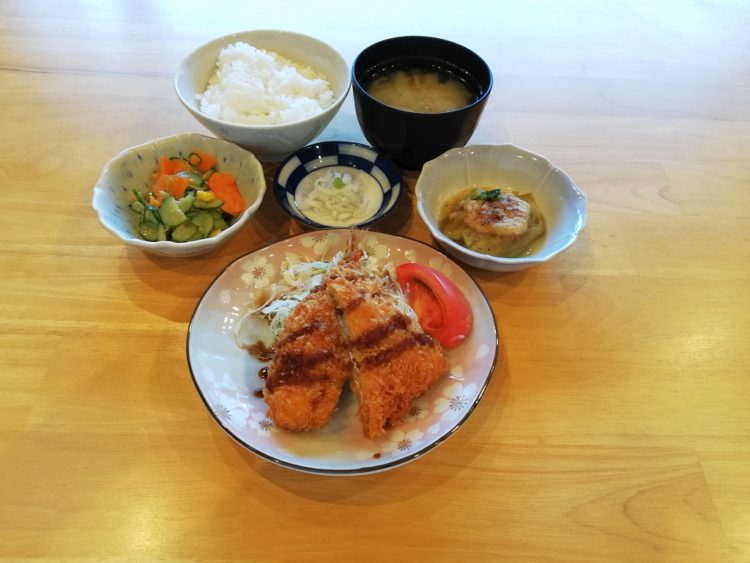 ごはん、白菜のみそ汁、あじフライ、焼きなす、きゅうりの和え物、白かぶ漬け
