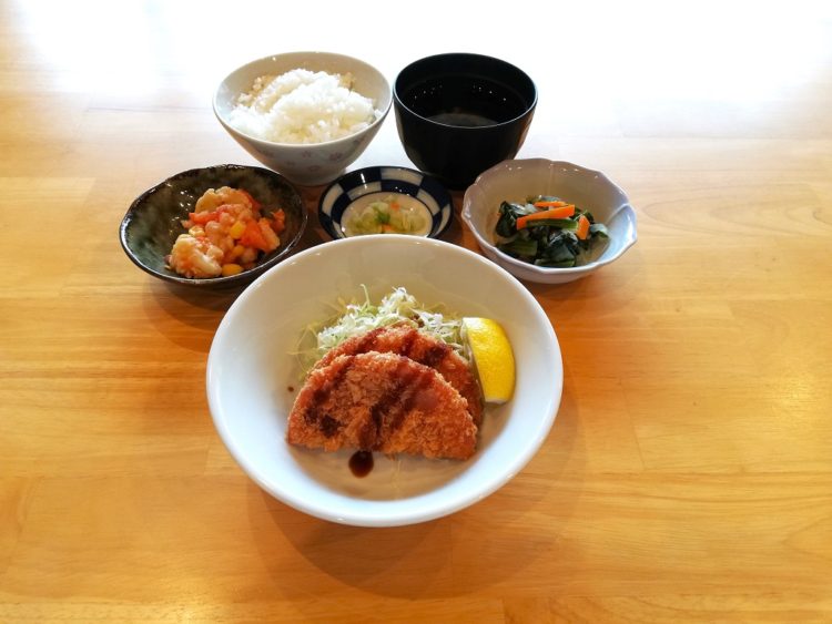 ごはん、椎茸のすまし汁、ハムカツ、ほうれん草の炒め物、カリフラワーサラダ、キャベツ漬け