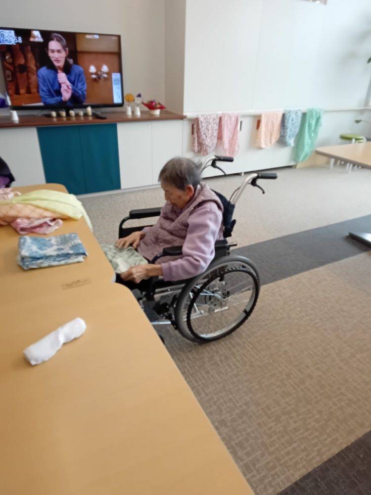 利用者の方々にエプロンを畳んで頂いております。