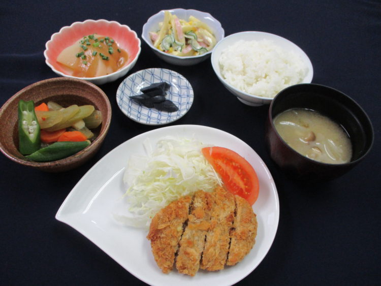 ご飯、玉葱としめじのみそ汁、メンチカツ、ふきとオクラの炊き合わせ、マカロニサラダ、ふろふき大根味噌たれかけ、なす漬