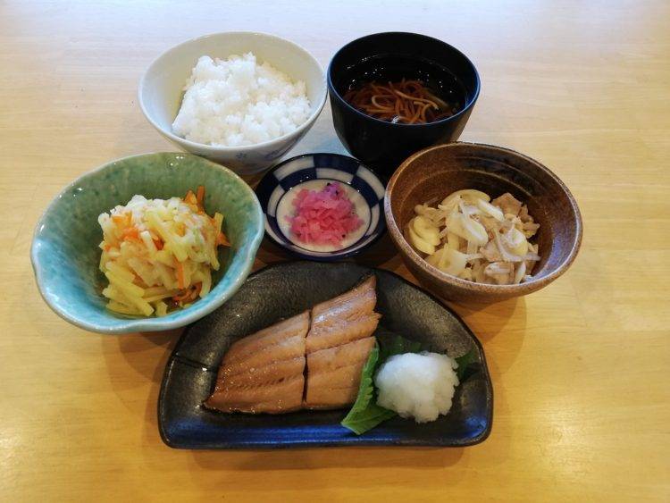 ごはん、そば汁、ホッケの漬け焼き、たけのこの炒め物、さつま芋のサラダ、桜大根漬け