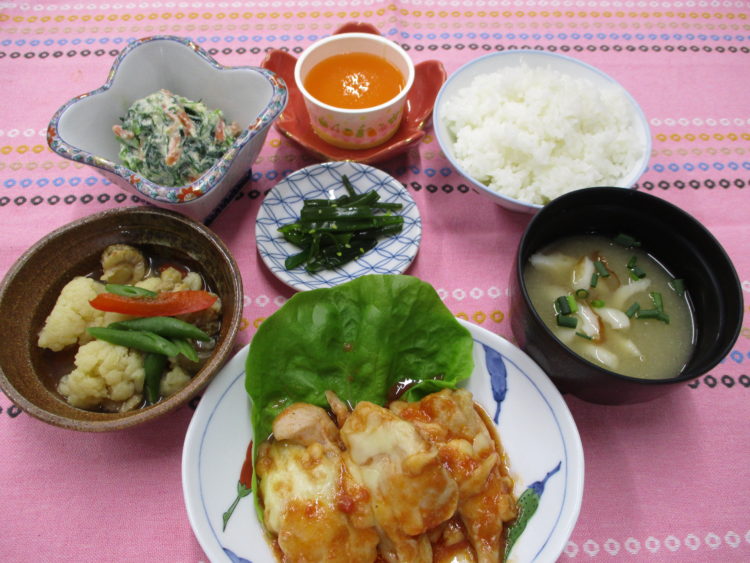 ご飯、竹輪とあさつきのみそ汁、鶏肉のチーズ焼き、カリフラワーと帆立のスープ煮、