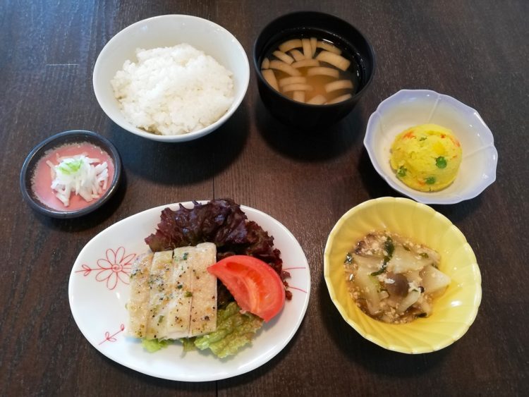 ごはん、板麩のみそ汁、鶏肉の塩だれ焼き、かぶの煮物、さつま芋のサラダ、白かぶ漬け