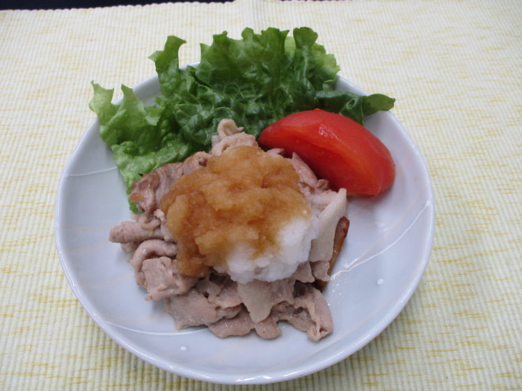 ご飯、わかめとねぎのみそ汁、豚肉のおろしポン酢がけ、わらびと生揚げの炒め物、小松菜のピーナッツ和え、桜大根漬、ピーチゼリー
