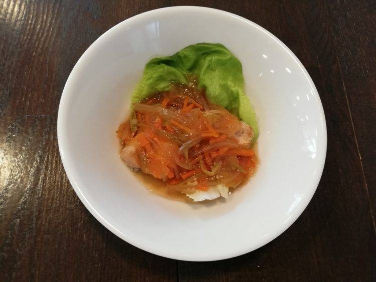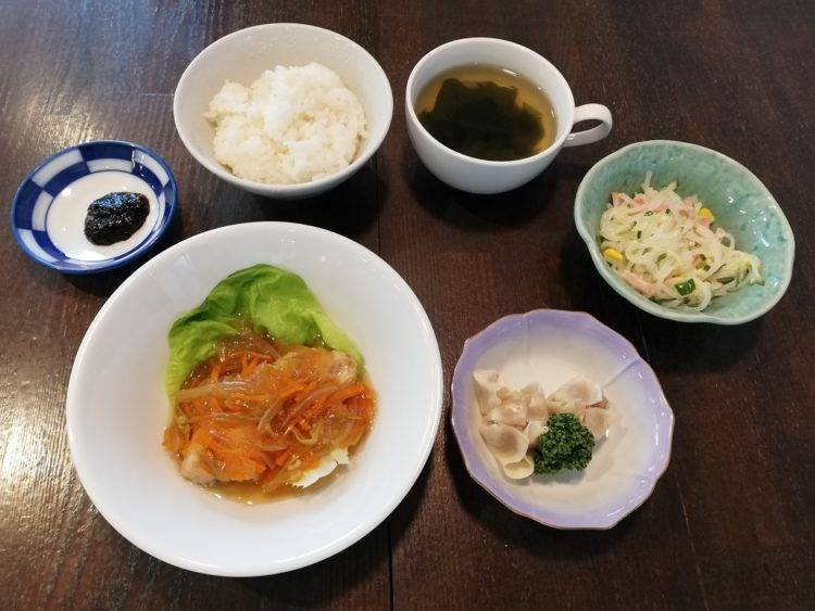 ごはん、わかめスープ、メバルの甘酢あんかけ、ポークしゅうまい、春雨とハムのサラダ、