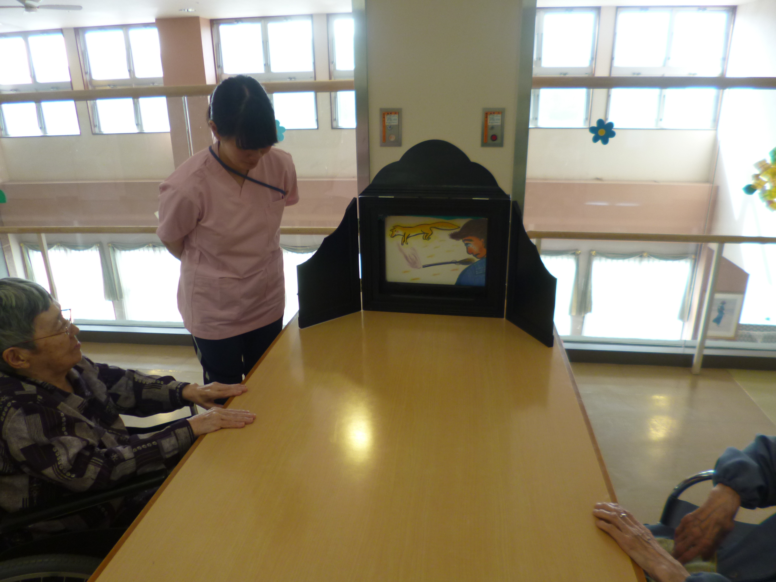 今日は、ショートステイ2FでM介護員によるごんぎつねの紙芝居を上演しました。