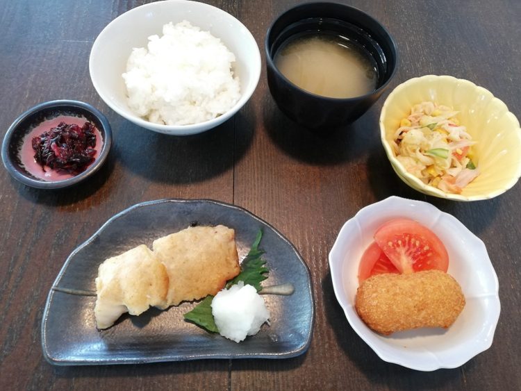 ごはん、玉葱のみそ汁、赤魚のごまみそ焼き、かにクリームコロッケ、カリフラワーの和え物、