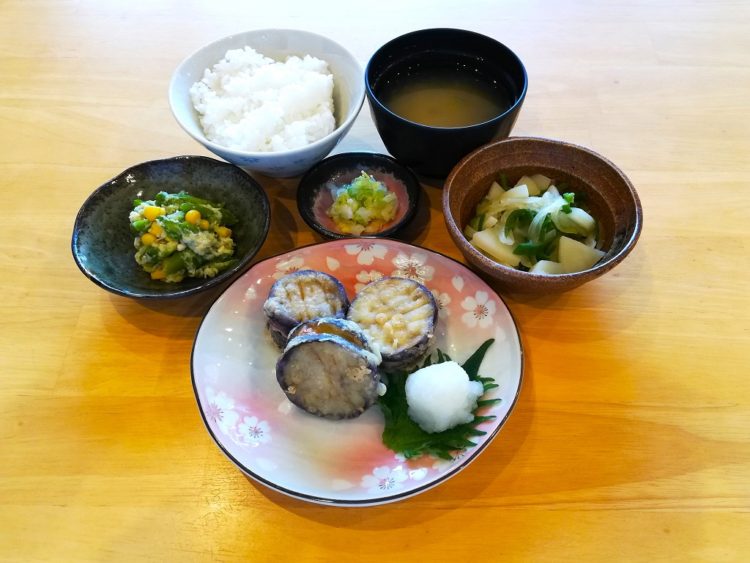 ごはん、しめじのみそ汁、なすの挟み揚げ、じゃが芋のソテー、アスパラのサラダ、白菜漬け