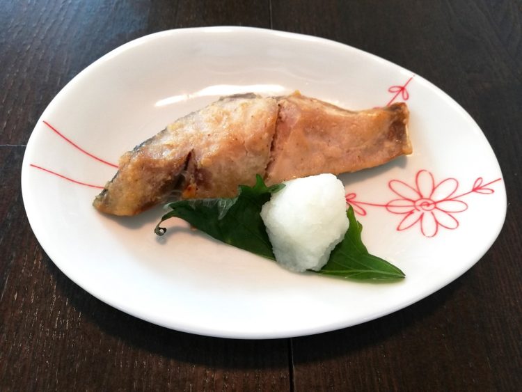 ごはん、あさりのみそ汁、あじの味噌焼き、青梗菜の炒め物、タマゴパスタ、梅吹雪