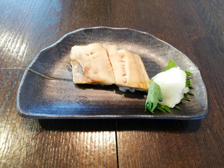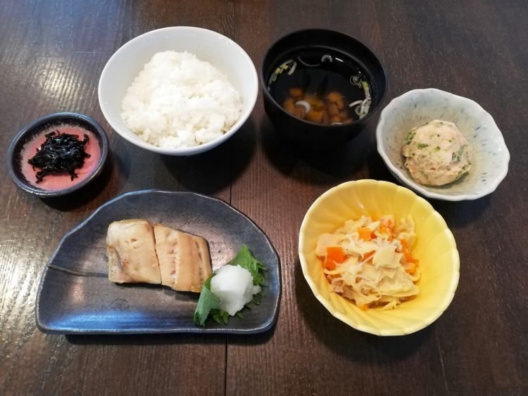 ごはん、椎茸のすまし汁、ほっけの塩焼き、たけのこの炒め物、里芋のサラダ、しそ昆布