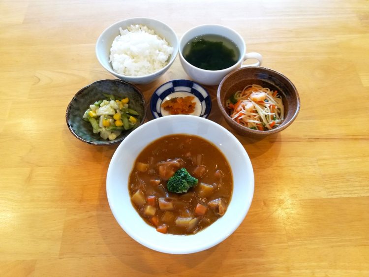ごはん、わかめのスープ、チキンカレー、ビーフンソテー、アスパラのごま和え、福神漬け