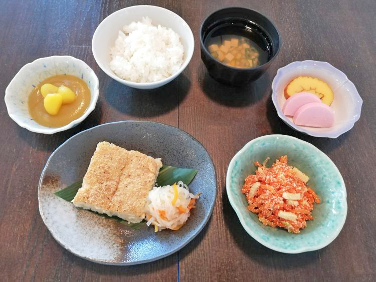 ごはん、オクラのすまし汁、鶏肉の松風焼き、人参の子和え、栗きんとん、伊達巻、かまぼこ