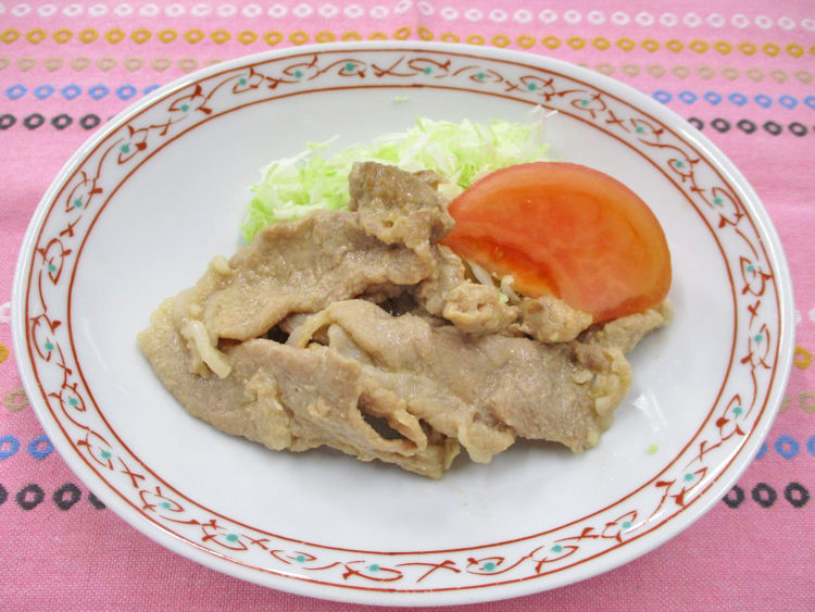 ご飯、はんぺんとあさつきのみそ汁、豚肉の生姜焼き、アスパラといかのソテー、白菜の甘酢漬、わかめ磯漬、黒豆