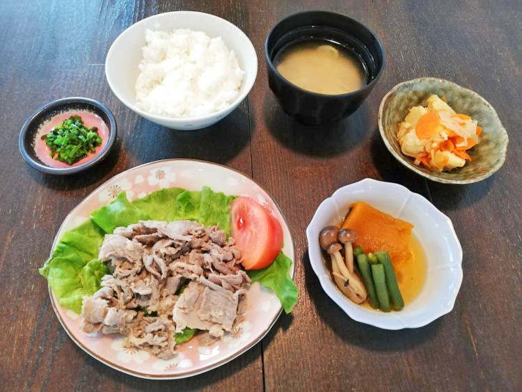 ごはん、細竹のみそ汁、牛肉の味噌漬け焼き、南瓜の煮物、カリフラワーサラダ、しその実漬け