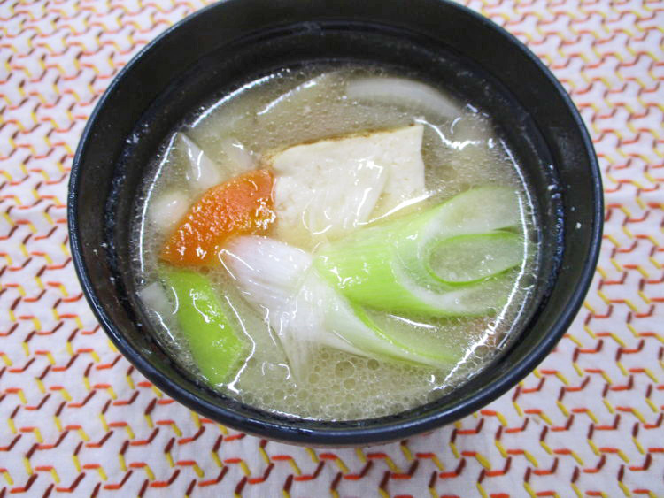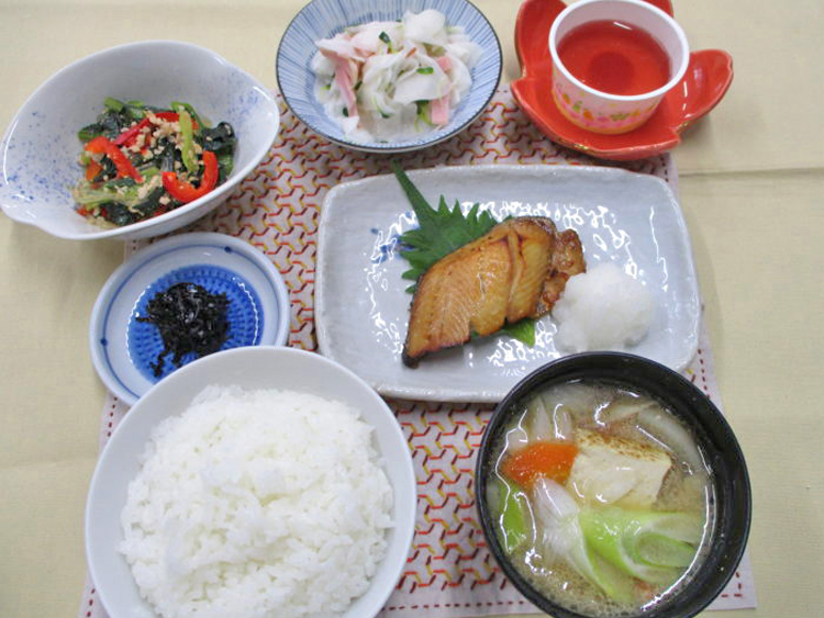ご飯、豚汁、ほっけの照り焼き、小松菜と豚ひき肉の炒め物、しそ昆布、ぶどうゼリー