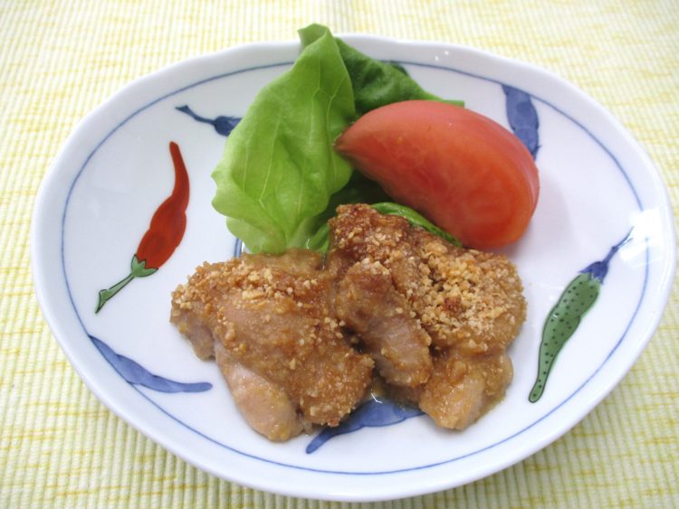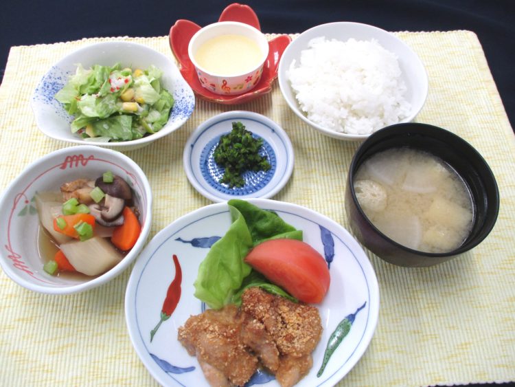 ご飯、大根と油揚げのみそ汁、鶏肉のピーナッツ焼き、かぶと帆立の煮物、