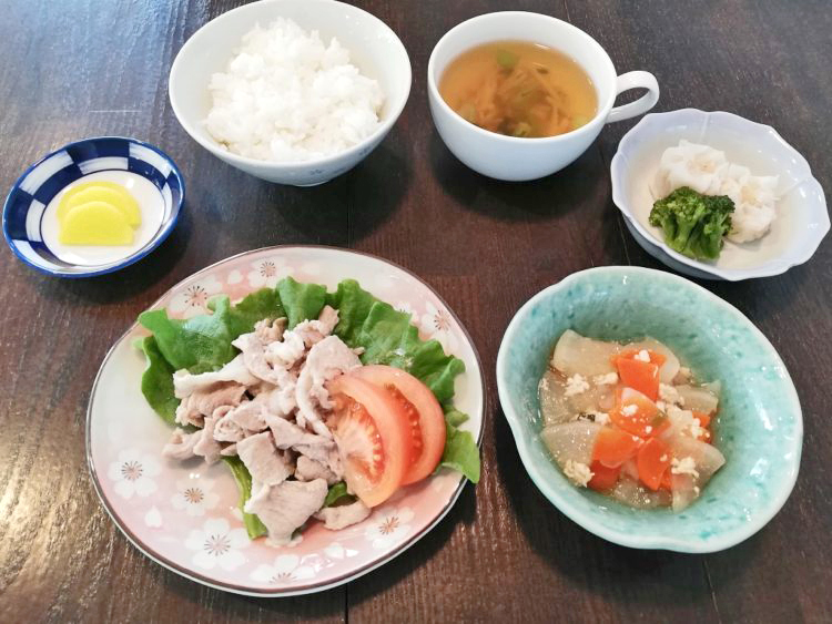 ごはん、たけのこの中華スープ、豚肉の塩だれ焼き、大根そぼろ煮、蒸ししゅうまい、