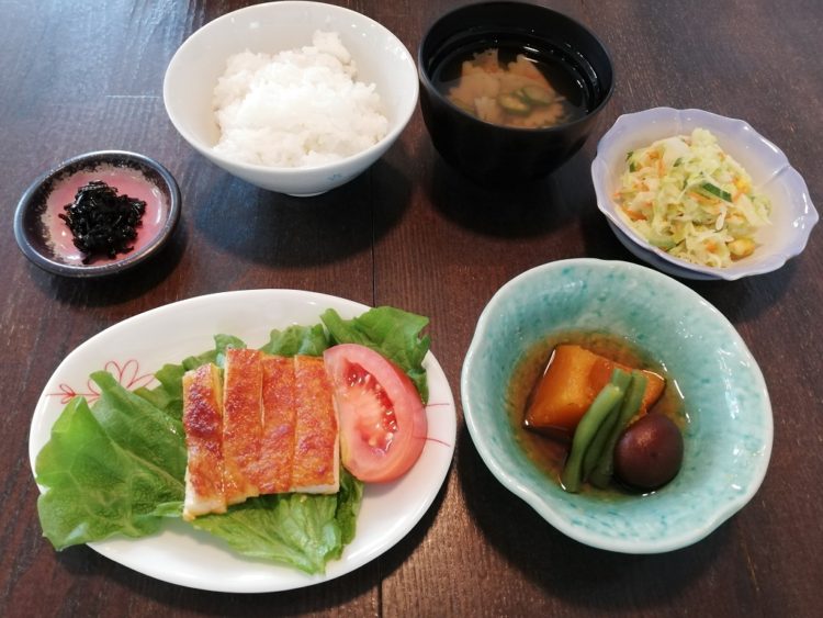 ごはん、オクラのすまし汁、タンドリーチキン、南瓜の煮物、コールスローサラダ、しそ昆布