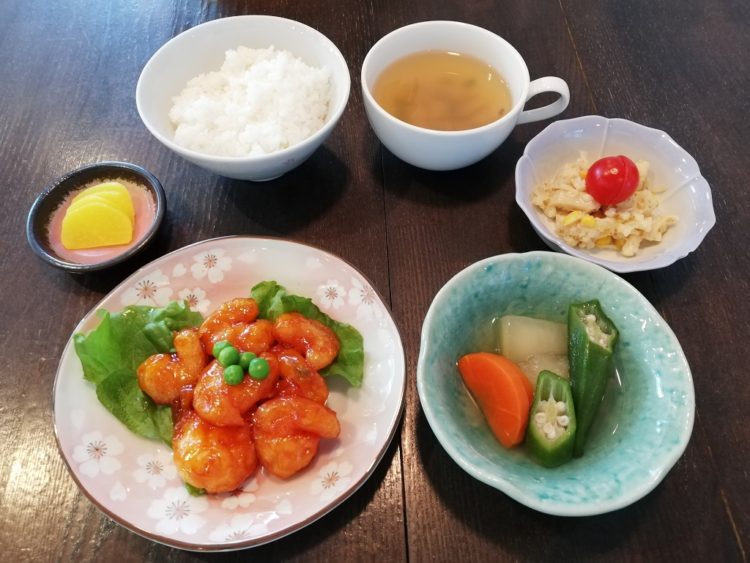 ごはん、あさりのスープ、えびのチリソース、冬瓜の煮物、カリフラワーサラダ、たくあん漬け