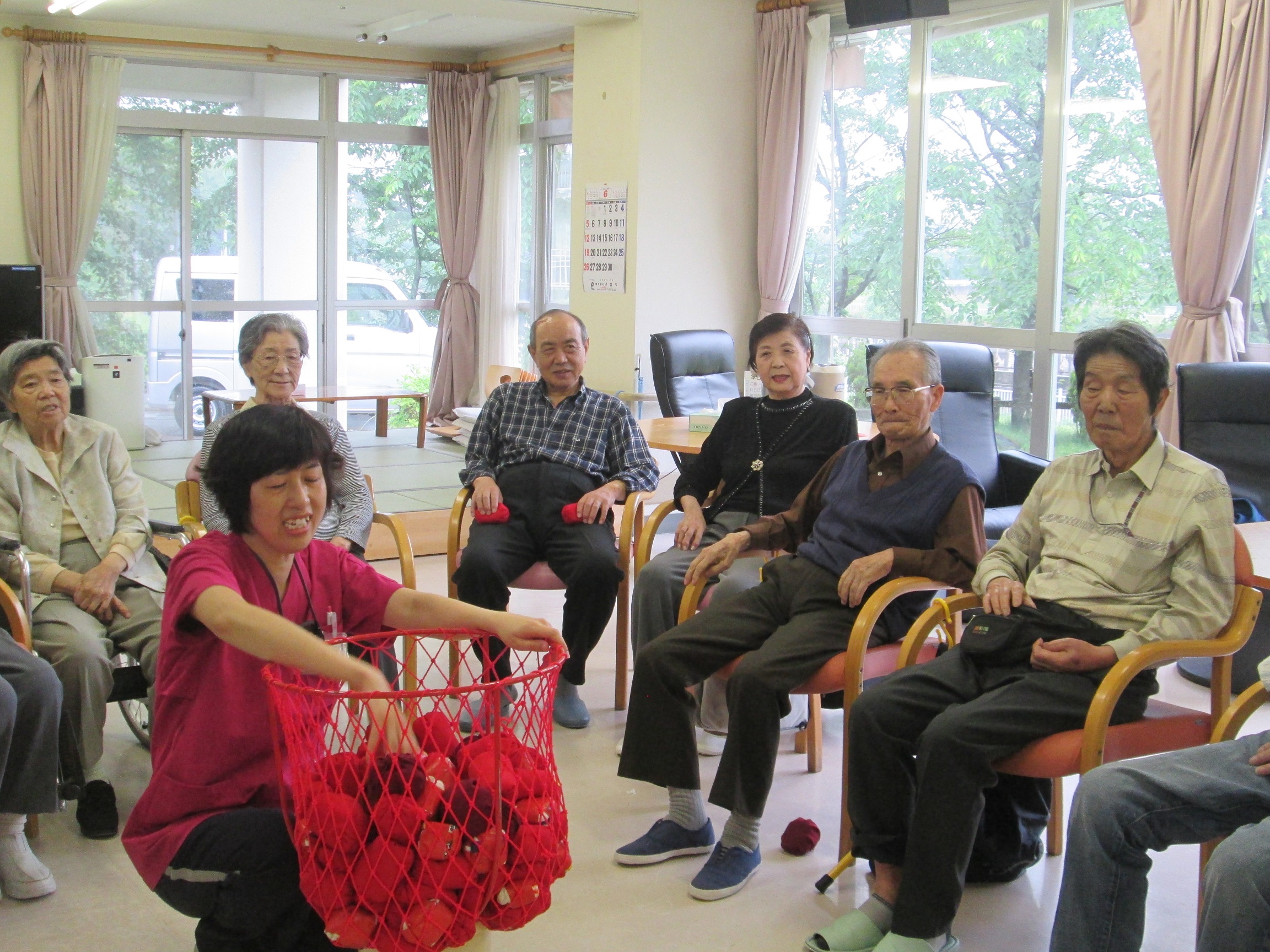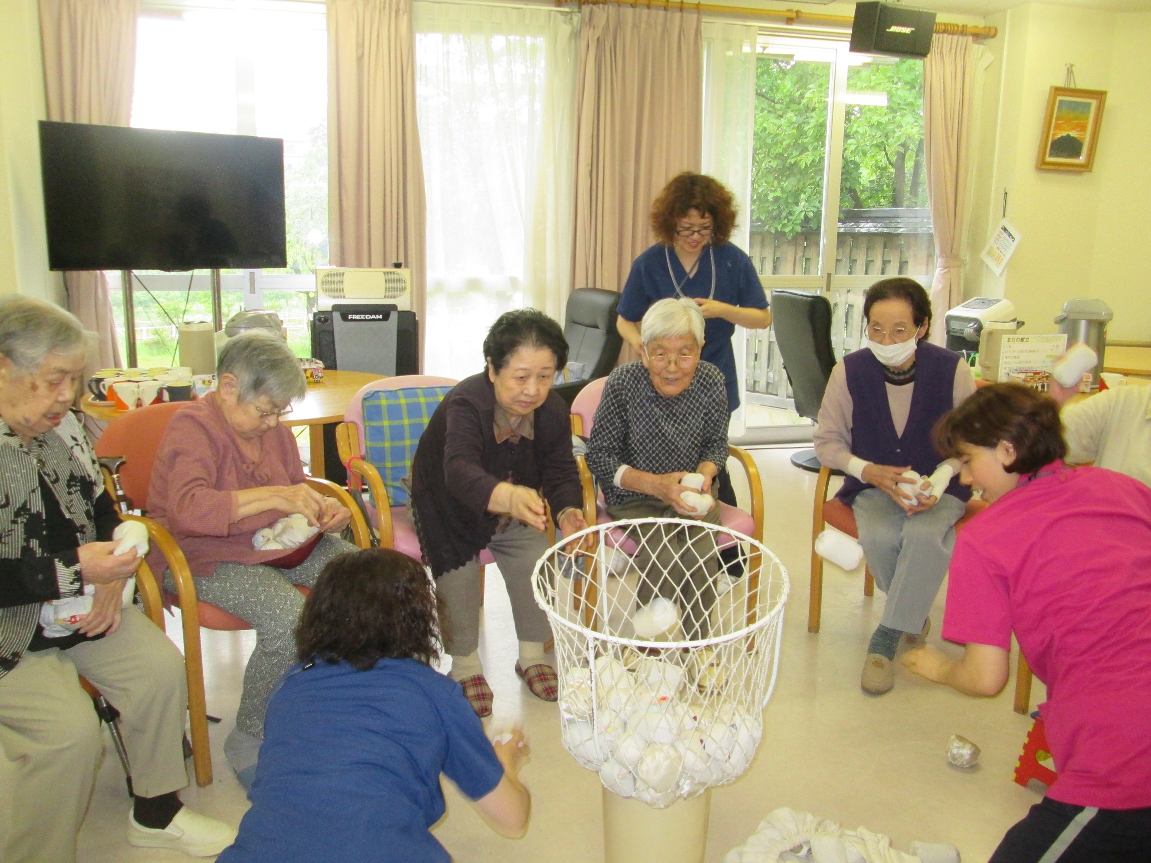 今日は、2回目の玉入れでした。東(赤組)と西(白組)で玉入れをやりました。皆さん、膝にいっぱいのせて玉を投げていました。