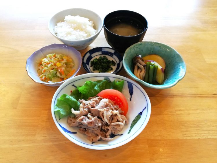 ごはん、ぜんまいのみそ汁、豚肉のピーナッツ焼き、さつま芋煮、キャベツサラダ、しその実漬け