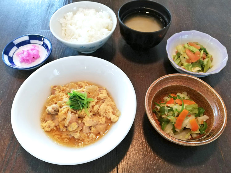 ごはん、大根のみそ汁、親子煮、キャベツの炒め物、アスパラのサラダ、桜大根漬け