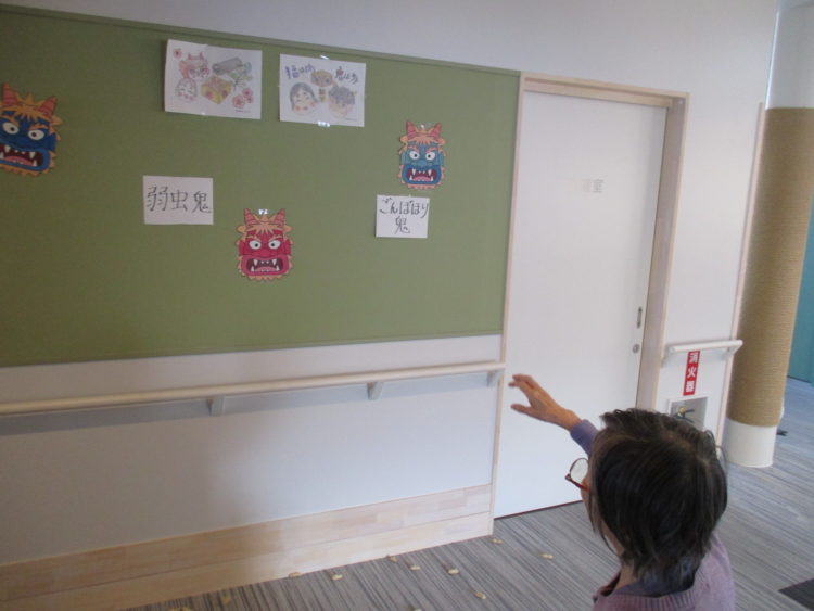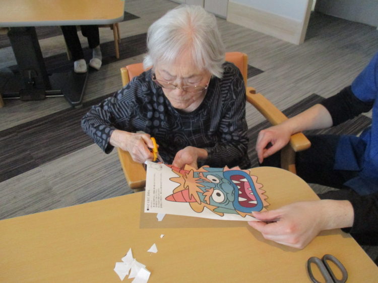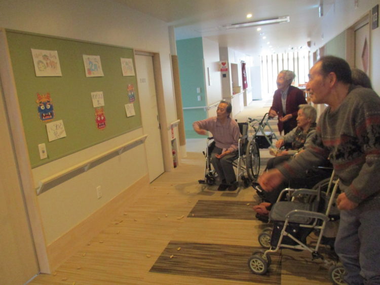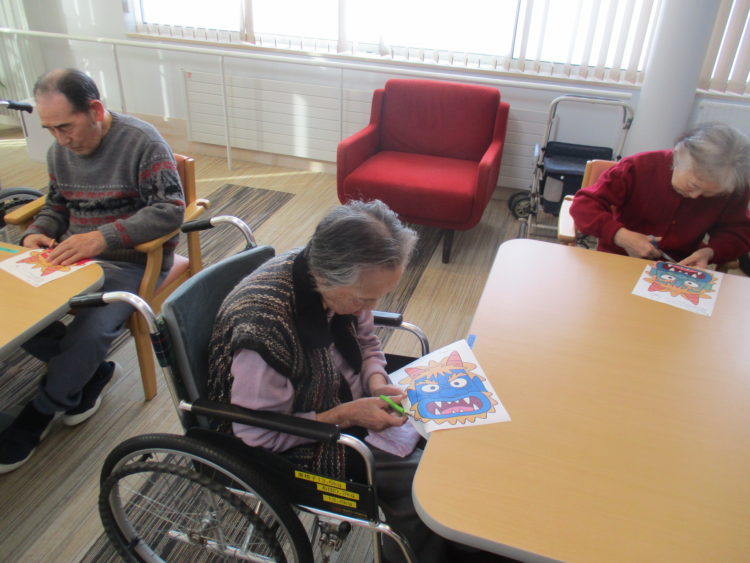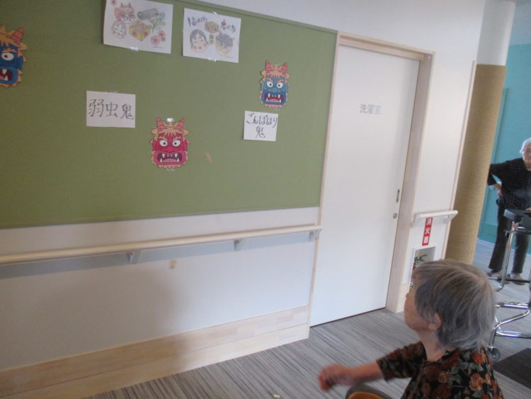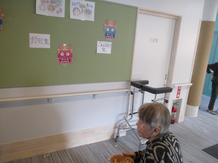 グループホーム城南山崎では、お客様に鬼のお面を作成して頂き、職員がお面を被り、豆まきを・・・と思いましたが、お客様より「いつも世話になってるあなた達に豆は投げられない」等のお言葉を頂いた為、壁に鬼のお面を貼り、豆まきを行いました。鬼の名前もお客様につけて頂きました。昔から自分の性格で気になっているところを退治したいとのことでした。そのお言葉を聞き、私達職員も再度お客様に感謝をし、お手伝いをさせて頂きたいと感じております。