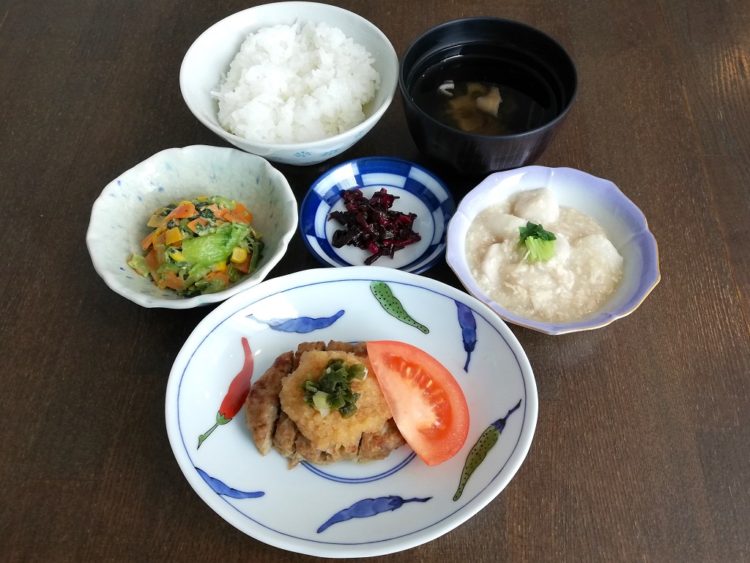 ごはん、舞茸のすまし汁、和風ハンバーグ、里芋のみそ煮、小松菜とコーンのサラダ、しば漬け