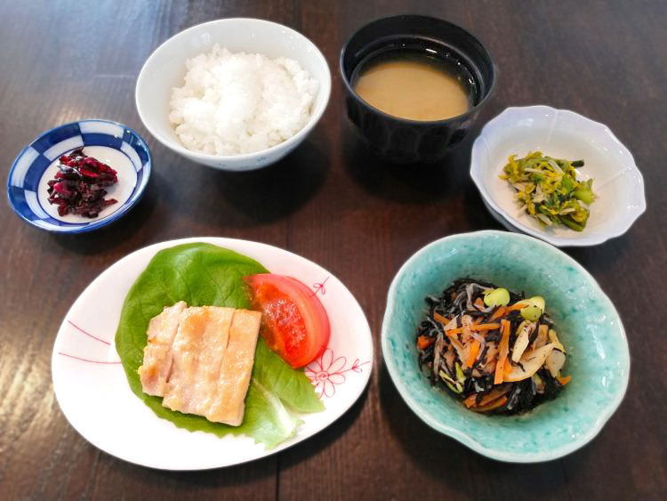 ごはん、玉葱のみそ汁、鶏肉の味噌漬け焼き、ひじきの炒め煮、小松菜の和え物、しば漬け