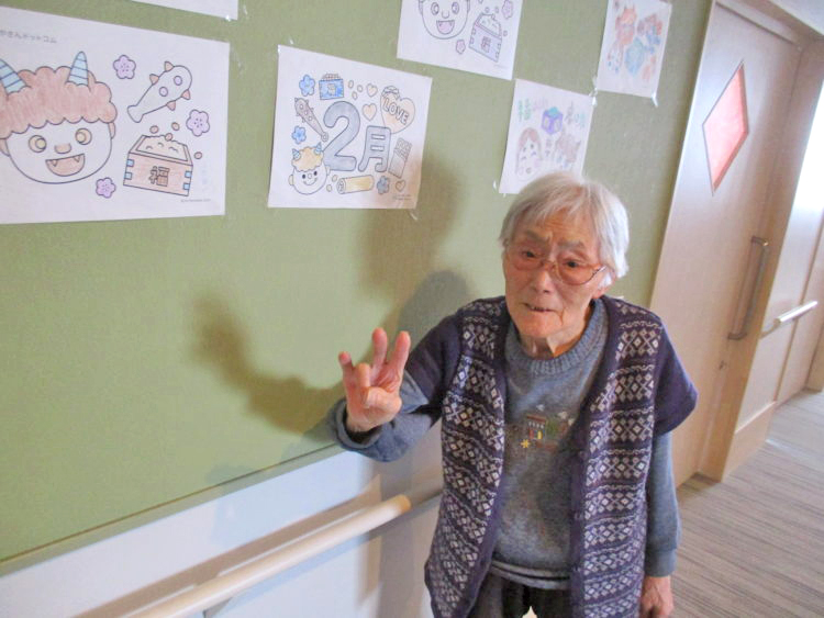 こちらはレク活動の際に塗り絵の作品です。お客様と一緒にパシャリと写真を撮りました。