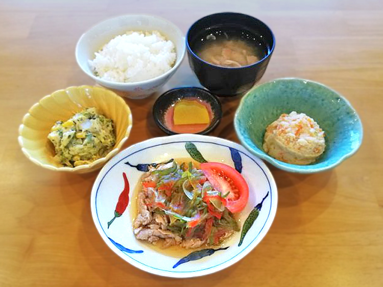 ごはん、舞茸のみそ汁、豚肉の南蛮漬け、卯の花の炒り煮、ブロッコリーサラダ、たくあん漬け