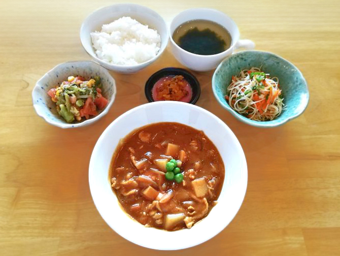 ごはん、わかめスープ、ポークカレー、ビーフンソテー、ブロッコリーサラダ、福神漬け