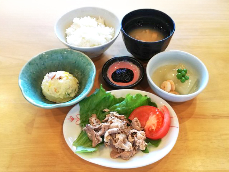 ごはん、もやしのみそ汁、豚肉の青じそ風味焼き、冬瓜のあんかけ、ポテトサラダ、のり佃煮