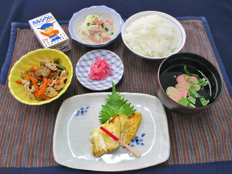 ご飯、花麩と三つ葉の清汁、めばるの西京焼き、いんげんと豚肉の炒め物、かぶとハムのサラダ、梅吹雪漬、カルゲンミニ