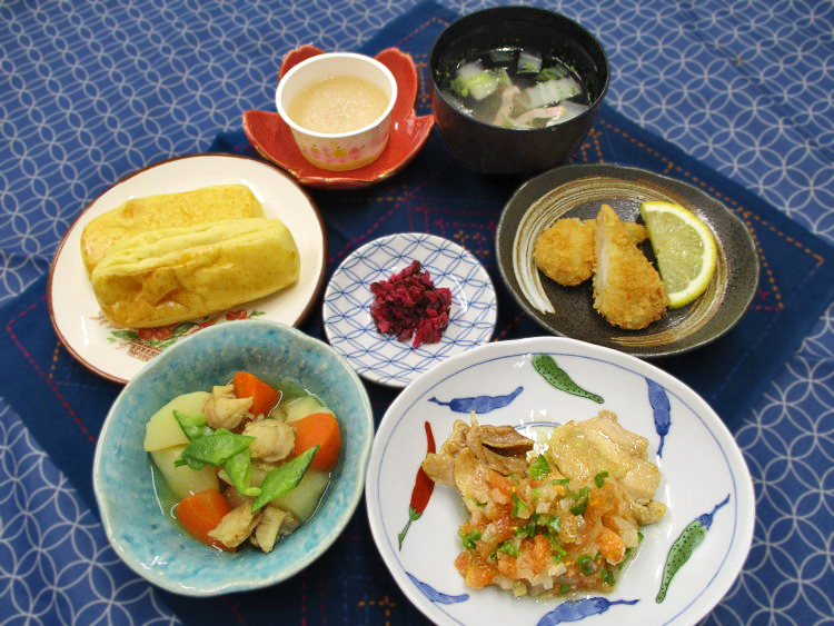 十勝バターのミニパン、白菜とハムのスープ、鶏肉のサルサソースかけ、じゃが芋と帆立の煮物、