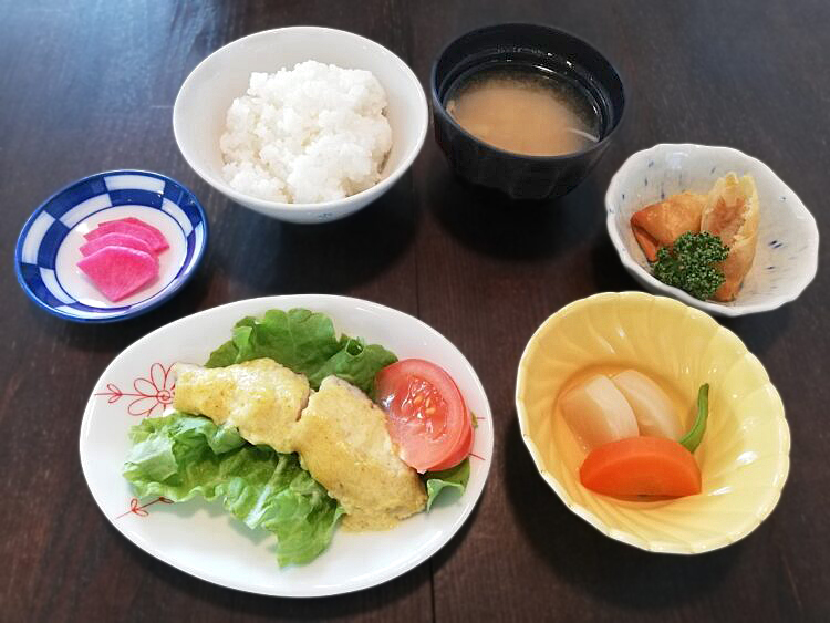 ごはん、小大豆もやしのみそ汁、白身魚のカレー風味焼き、かぶの煮物、春巻き、赤かぶ漬け