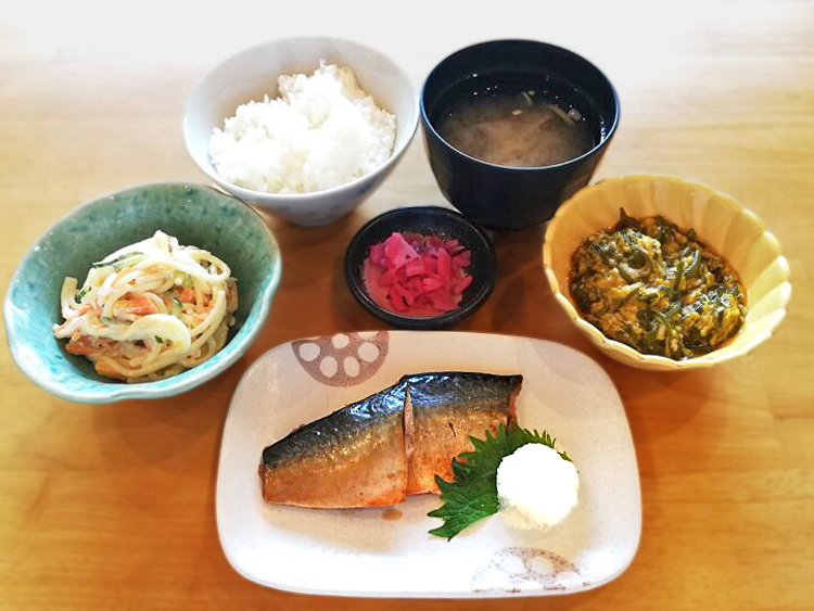 ごはん、さもだしのみそ汁、さばの生姜醬油焼き、スパゲティサラダ、めかぶとろろ和え、梅吹雪