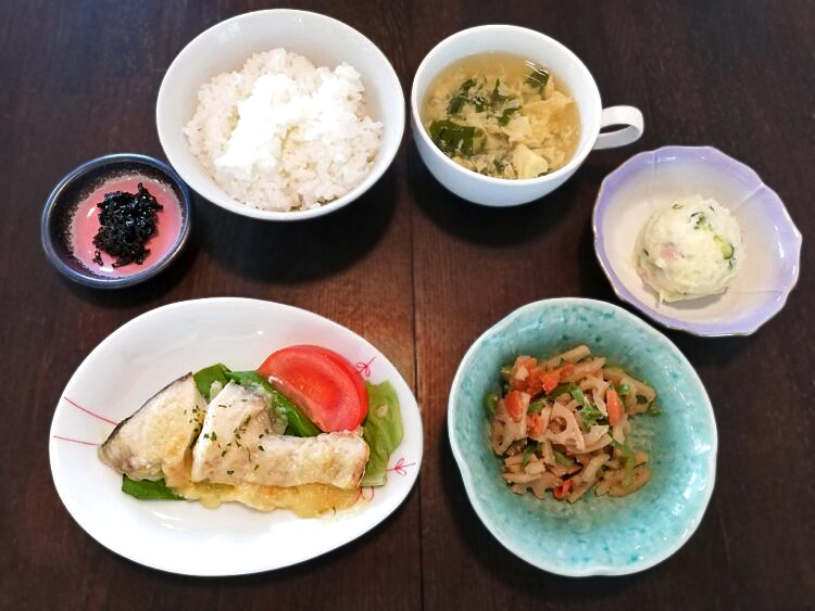 ごはん、たまごスープ、たらのチーズ焼き、れんこんの炒め物、ポテトサラダ、しそ昆布
