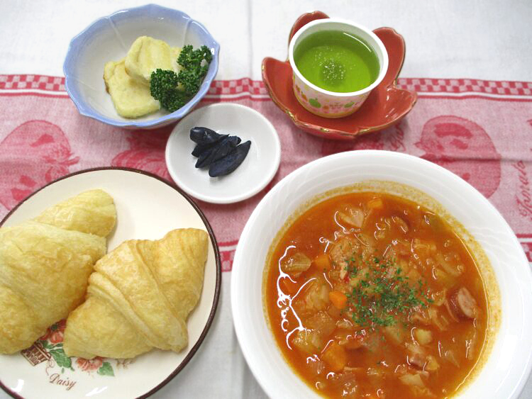 ミニクロワッサン、ミネストローネ、豆腐ナゲット、なす漬、青りんごゼリー