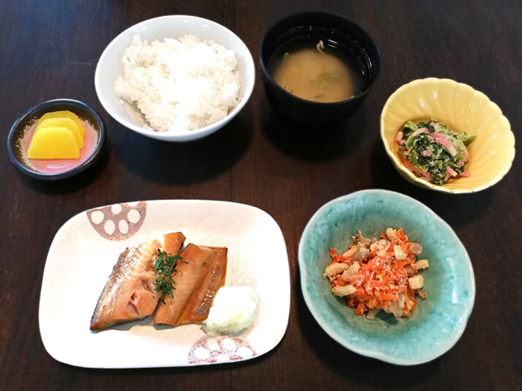 ごはん、豆腐のみそ汁、ホッケみりん漬け焼き、人参の子和え、ほうれん草ごま和え、