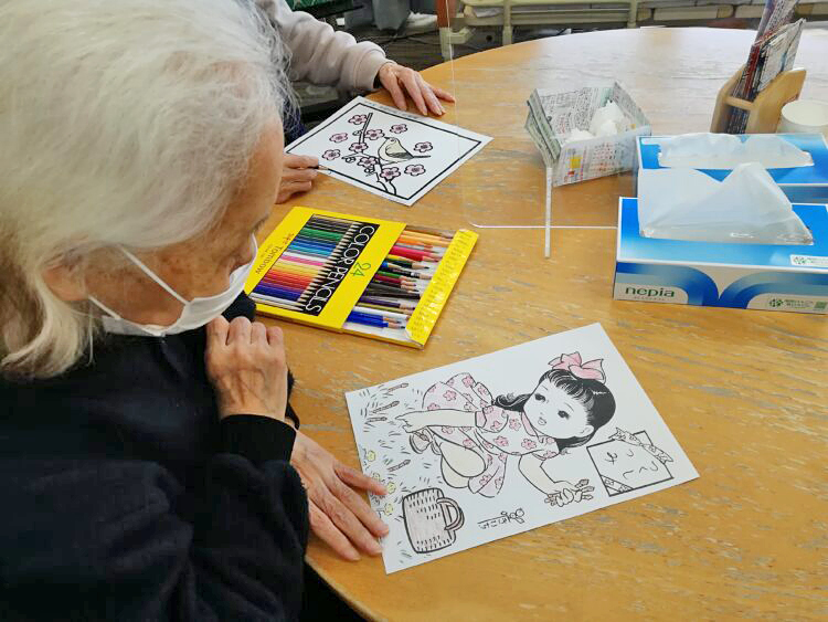 今日は天気も良く皆様ぼーっとしていたいと言いたそうな顔をされておりました。脳トレと言った瞬間苦い表情を見せたお客様もいらっしゃいましたが・・・・・・プリント問題を配るとやる気モード全開で真剣に取り組んでくださいました。また、塗り絵参加のお客様も色使いを考慮しながら綺麗に仕上げてくださいました。