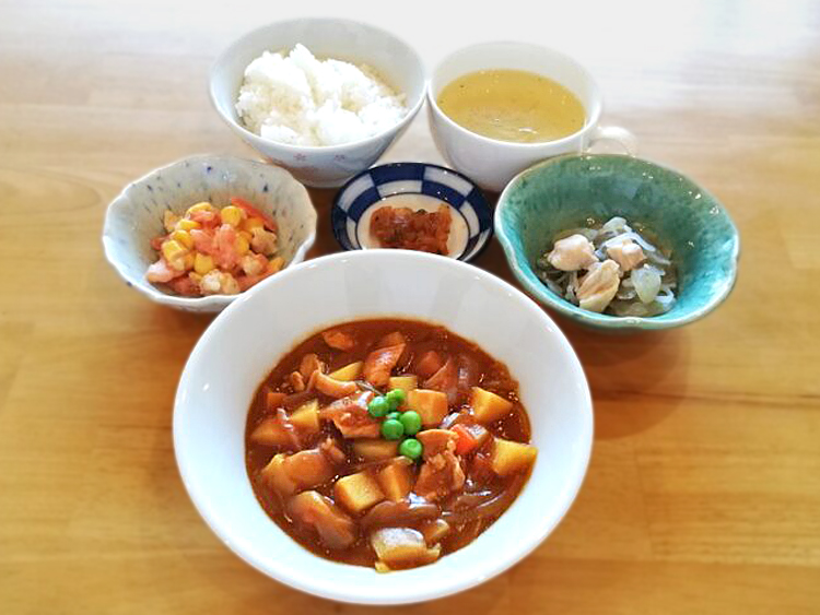 ごはん、コンソメスープ、ポークカレー、ふきの炒め物、トマトのサラダ、福神漬け