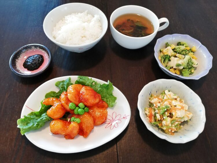 ごはん、青梗菜の中華スープ、えびのチリソース、炒り豆腐、ブロッコリーサラダ、のり佃煮