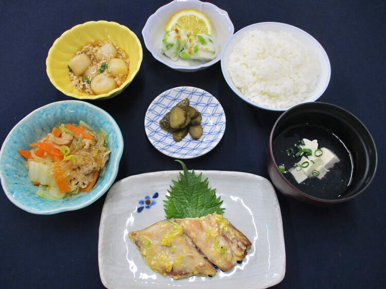 ご飯、豆腐とあさつきの清汁、あじのねぎ味噌焼き、白菜と春雨の中華風炒め煮、枝豆のふっくら揚げ、里芋のそぼろ煮、相馬きゅうり漬