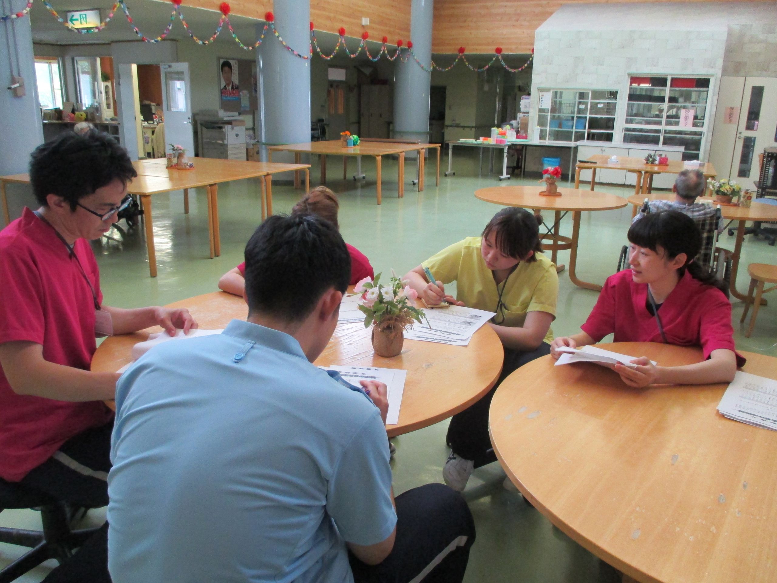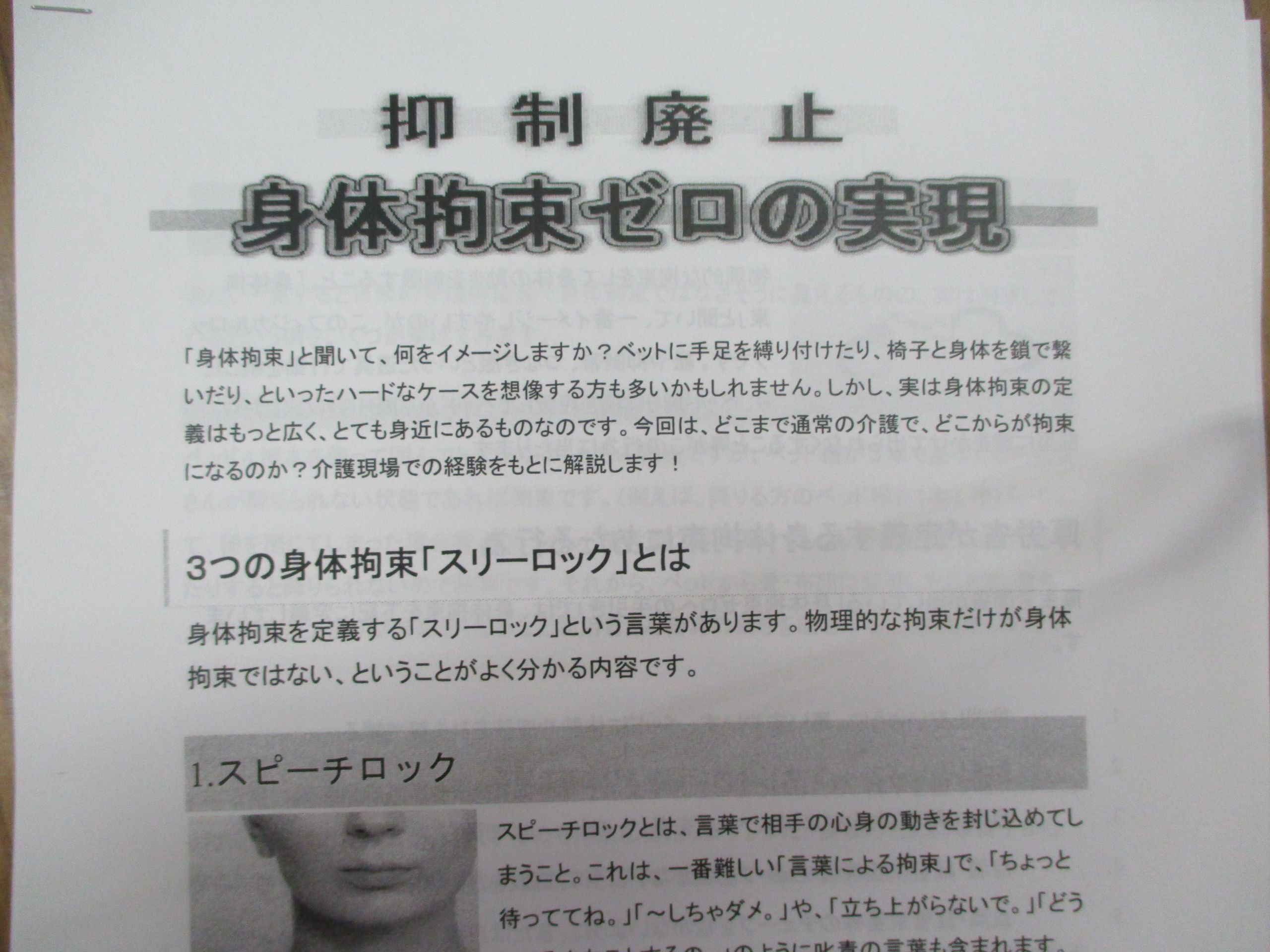 そんな今日は、内部研修を行いました!今月の研修のテーマは【身体拘束について】です。身体拘束と聞いてさまざまなイメージが湧くと思いますが、実は身体拘束の定義はもっと広く身近にあるものなのです!一見すると日常の介護の延長で身体拘束ではなさそうに見えるものの、実は拘束している!?という例を紹介しました。