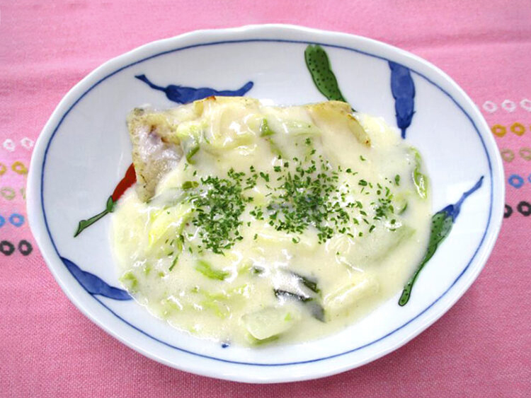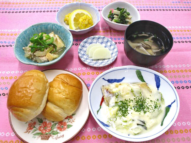 バターロール、舞茸のスープ、白身魚と白菜のクリーム煮、生揚げのそぼろ炒め、