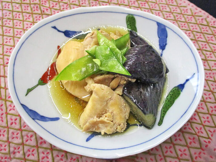 ご飯、玉葱とわかめのみそ汁、鶏肉となすのうま煮、カリフラワーとソーセージのソテー、ほうれん草のとろろ和え、卵豆腐のかにあんかけ、相馬きゅうり漬