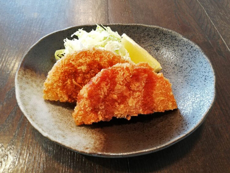 ごはん、なすのみそ汁、ポークハムカツ、小松菜の炒め煮、長芋の梅肉和え、福神漬け