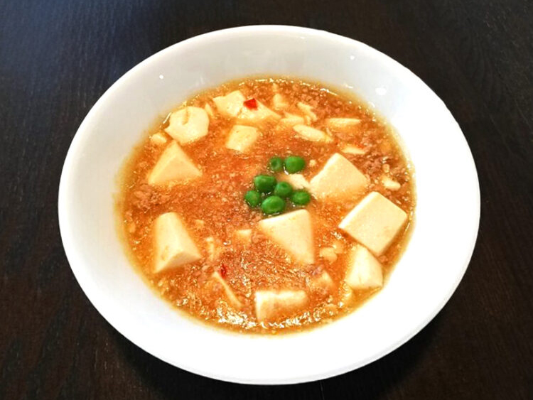 ごはん、麩のスープ、麻婆豆腐、リヨネーズポテト、青梗菜のごま和え、桜大根漬け