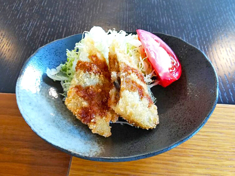 ごはん、椎茸のすまし汁、白身魚フライ、ブロッコリーサラダ、長芋の和え物、赤しその実漬け